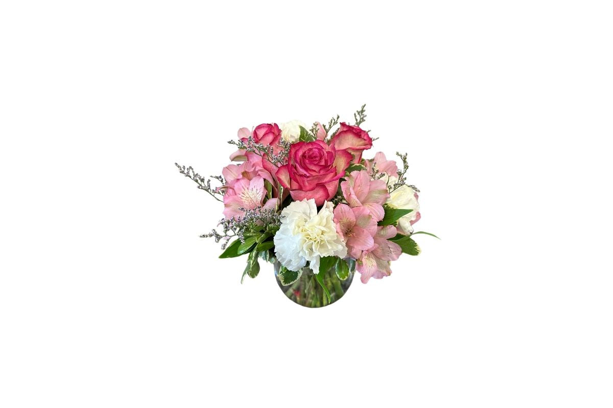 This lovely flower arrangement is designed with pops of perfect shades of pinks and whites. Soft, uplifting, and effortlessly charming, it brings a fresh breath of joy to any room—making it the perfect pick-me-up for celebrations, well-wishes, or “just because.”