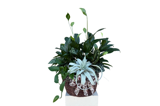 Bring a touch of calm to any space with this lush garden of easy-care greenery. The Airy Garden combines a variety of tropical plants — including peace lily, pothos, calathea, and silver-leafed beauties — arranged in a charming wicker basket and accented with a soft ribbon bow. Its layered textures and soothing colors create a naturally elegant display that thrives indoors. Perfect for offices, homes, or as a thoughtful sympathy or housewarming gift.